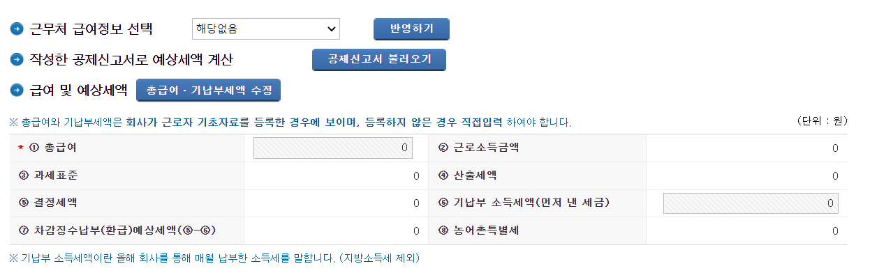 본인의 연간 총급여와 소득세 기납부세액 기입 후 적용하기.