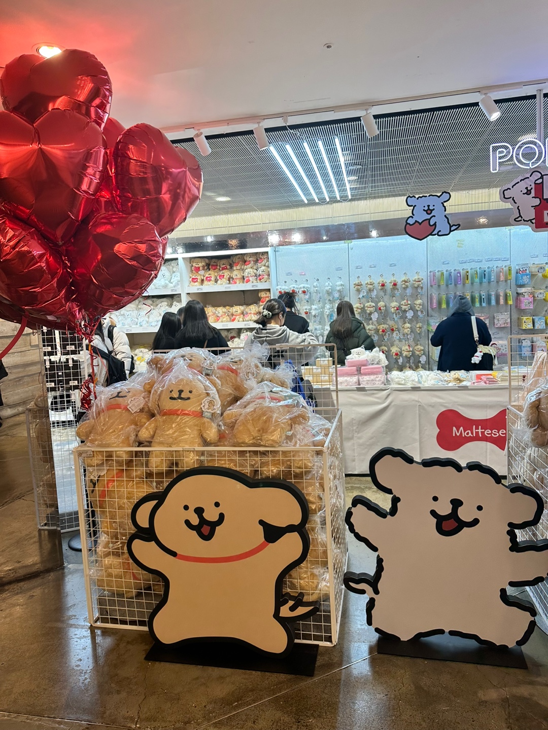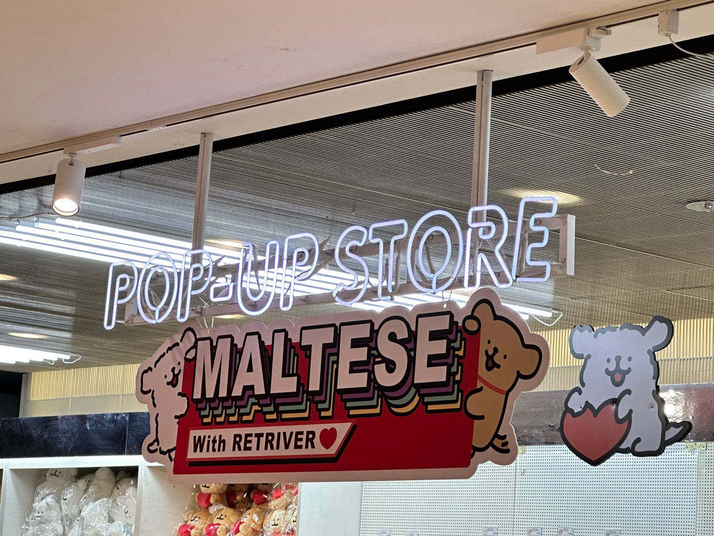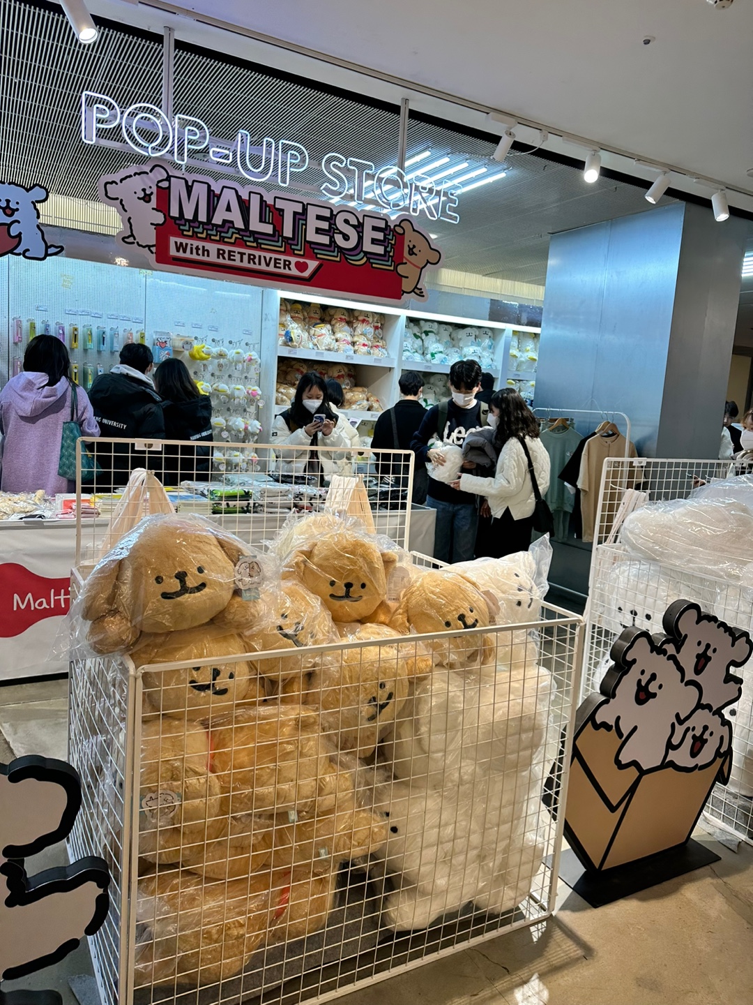 하찮으면서도 귀여운 콘셉트로 2030세대들의 감성을 자극하여 인기를 끌고 있는 문랩 스튜디오의 인기 이모티콘인 몰티즈와 리트리버, 오구 캐릭터 팝업스토어예요.