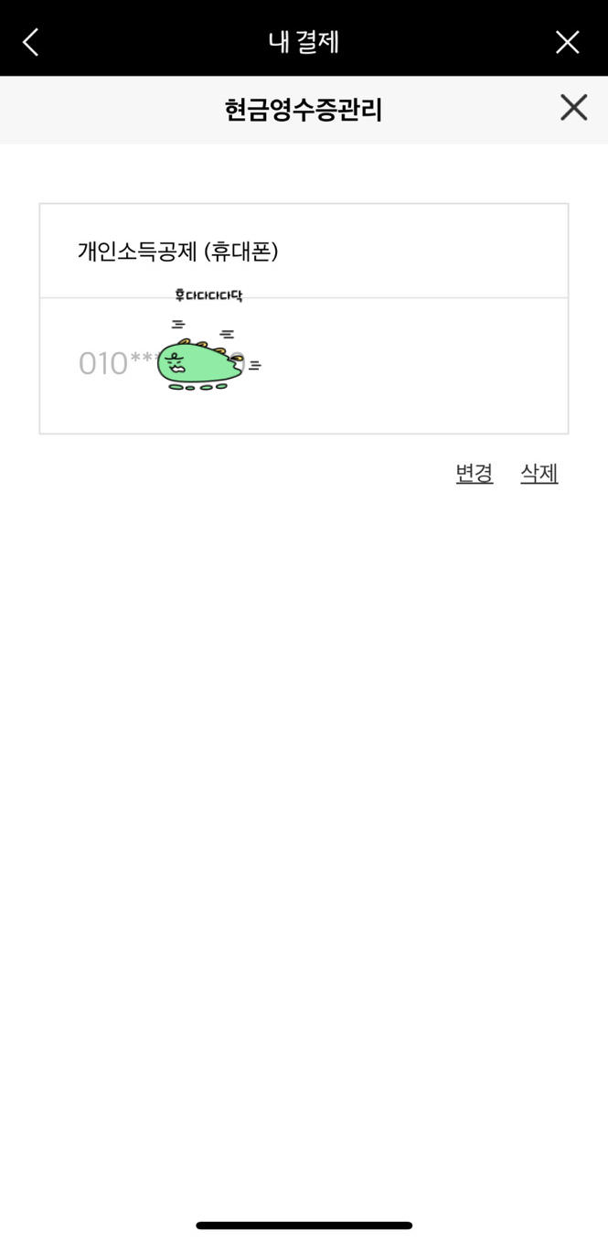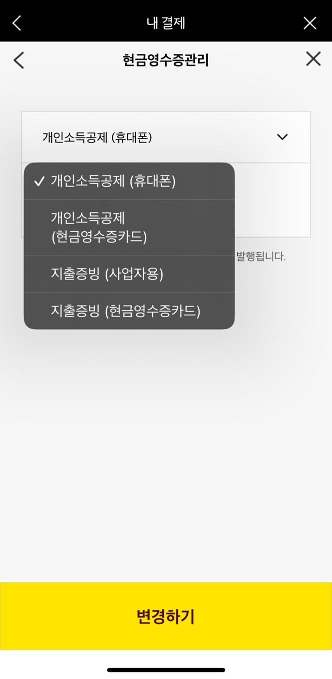 내 결제에서 '현금영수증 발행정보 관리'를 선택해주세요.
