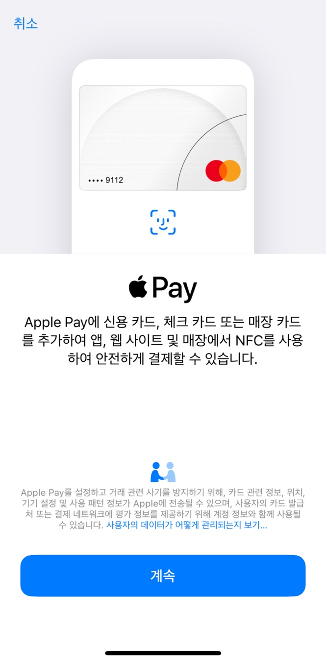 사용카드는 애플페이의 독점 계약자인 현대카드만 가능해요.