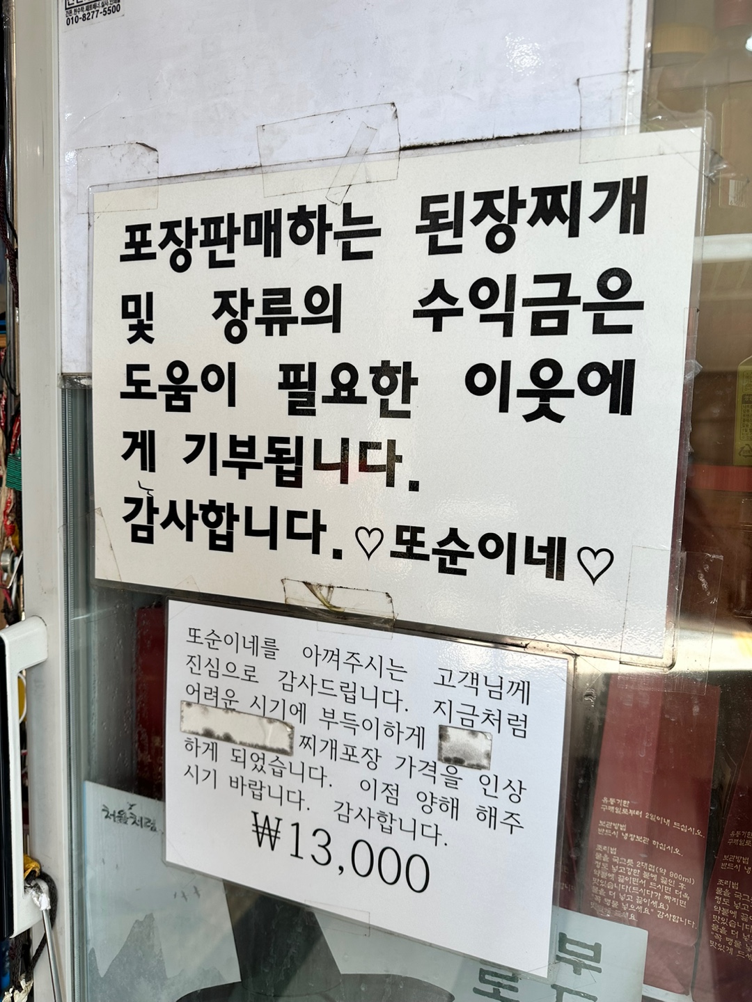 포장 판매하는 된장찌개의 수익금은 도움이 필요한 이웃들에게 기부까지 한다고 하니 더욱 더 포장을 안할 수가 없었죠.!